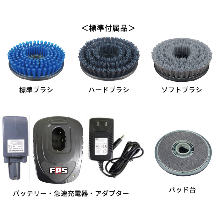 - スクラブランチャー本体、標準ブラシ6インチ、ハードブラシ6インチ、ソフトブラシ6インチ、バッテリー、急速充電器、アダプター、パッド台6インチ
